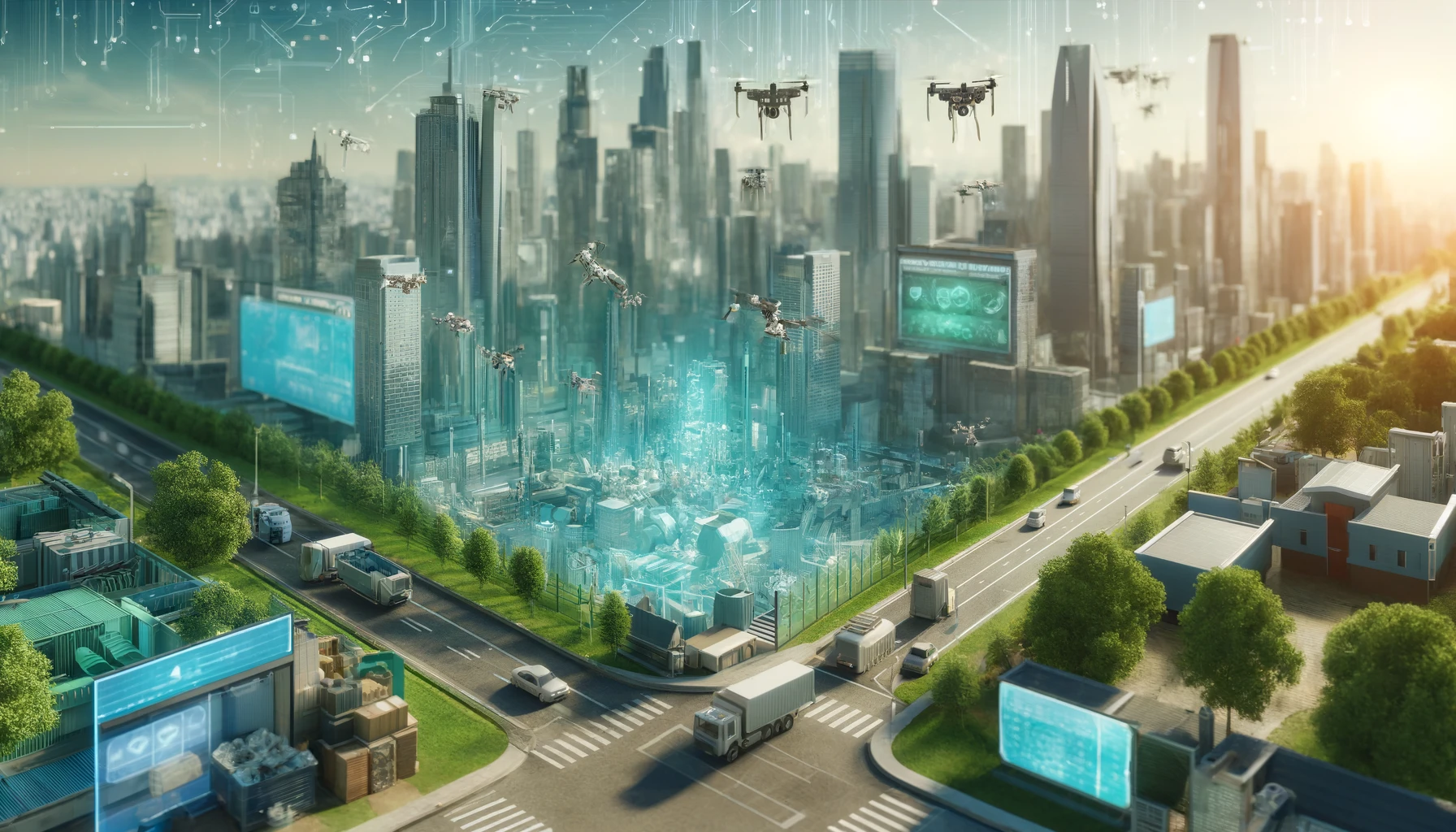 DALL·E 2024-04-24 10.51.08 – A wide image depicting a futuristic cityscape with advanced waste collection technology. The scene includes drones and robots efficiently sorting and par Cyril PRADEL | 24 Avr 2024